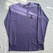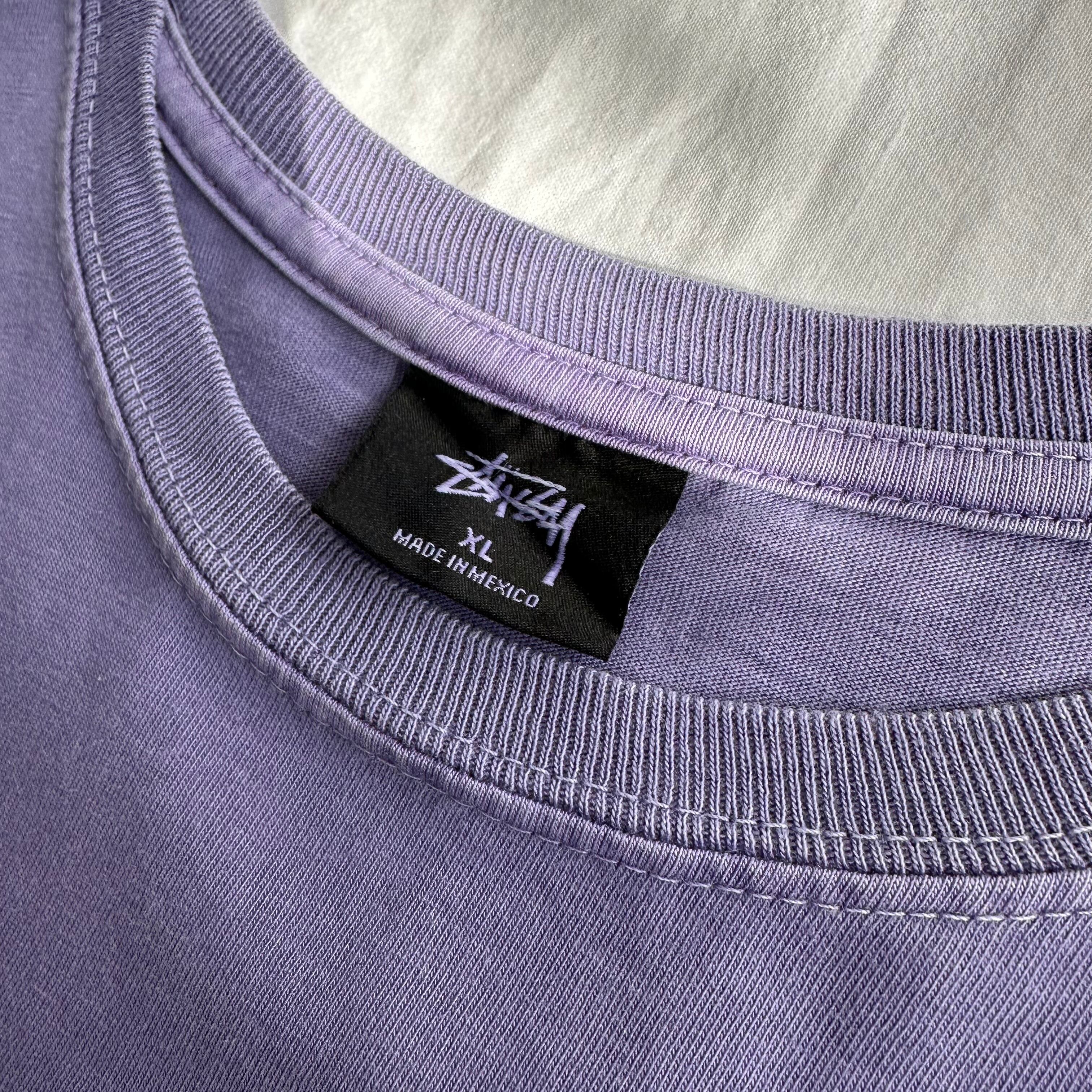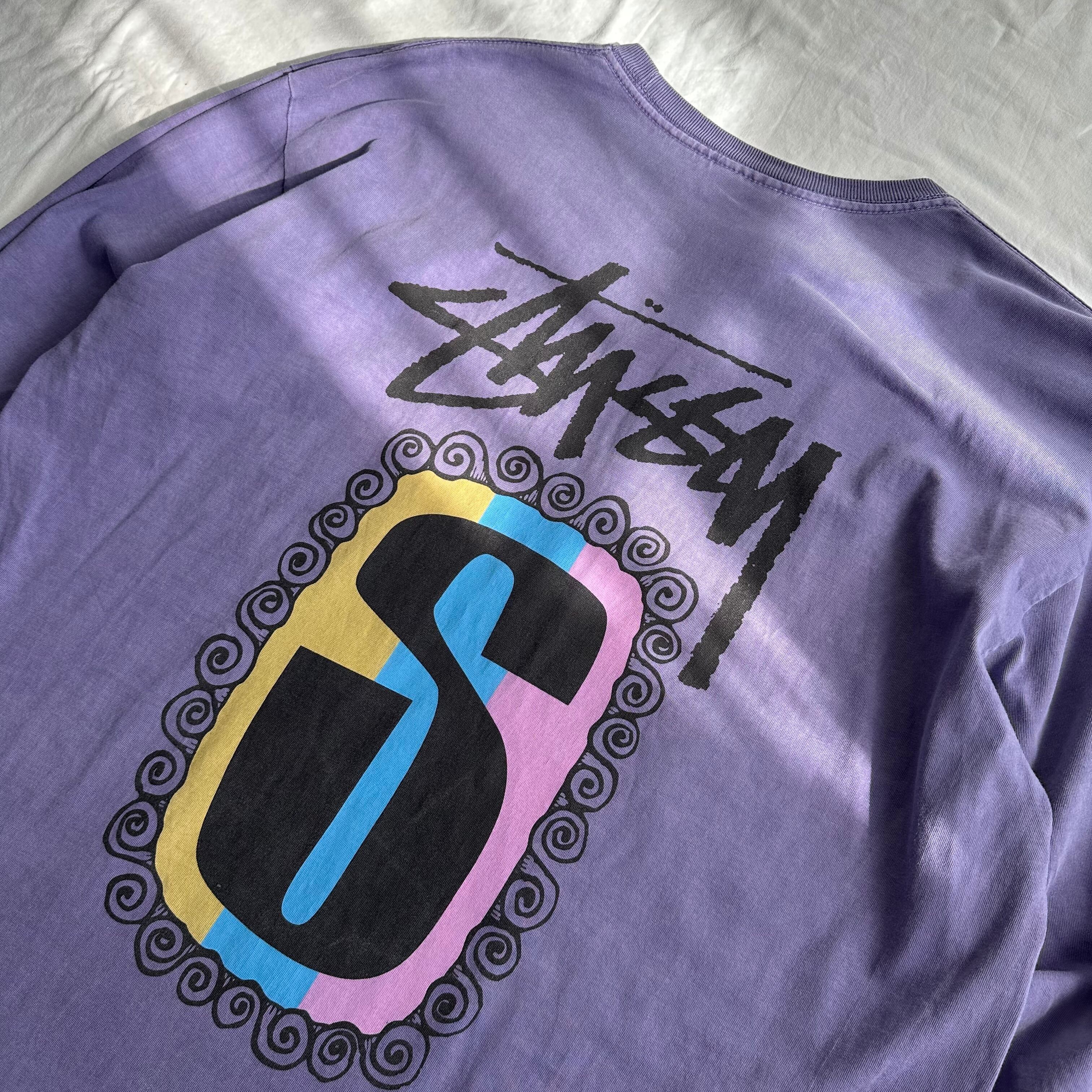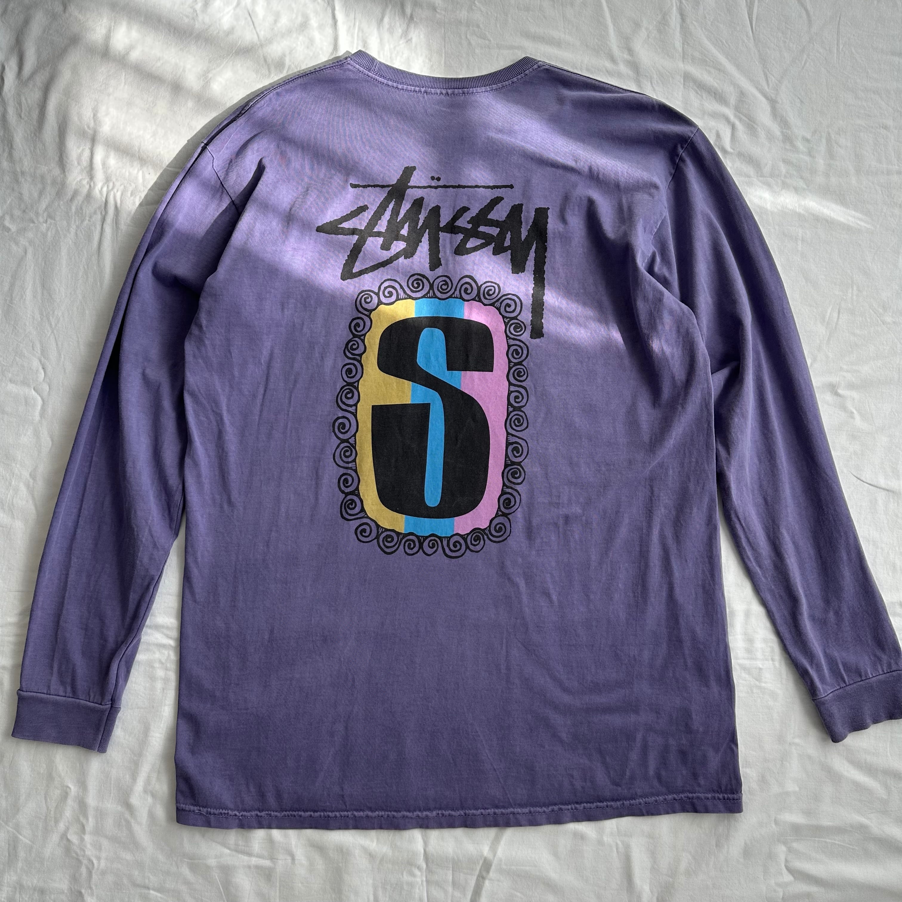 21年頃のステューシー、ピグメント染めSロゴ、ロングスリーブTシャツ。80s〜90sの復刻グラフィックを背中に配置した一枚。