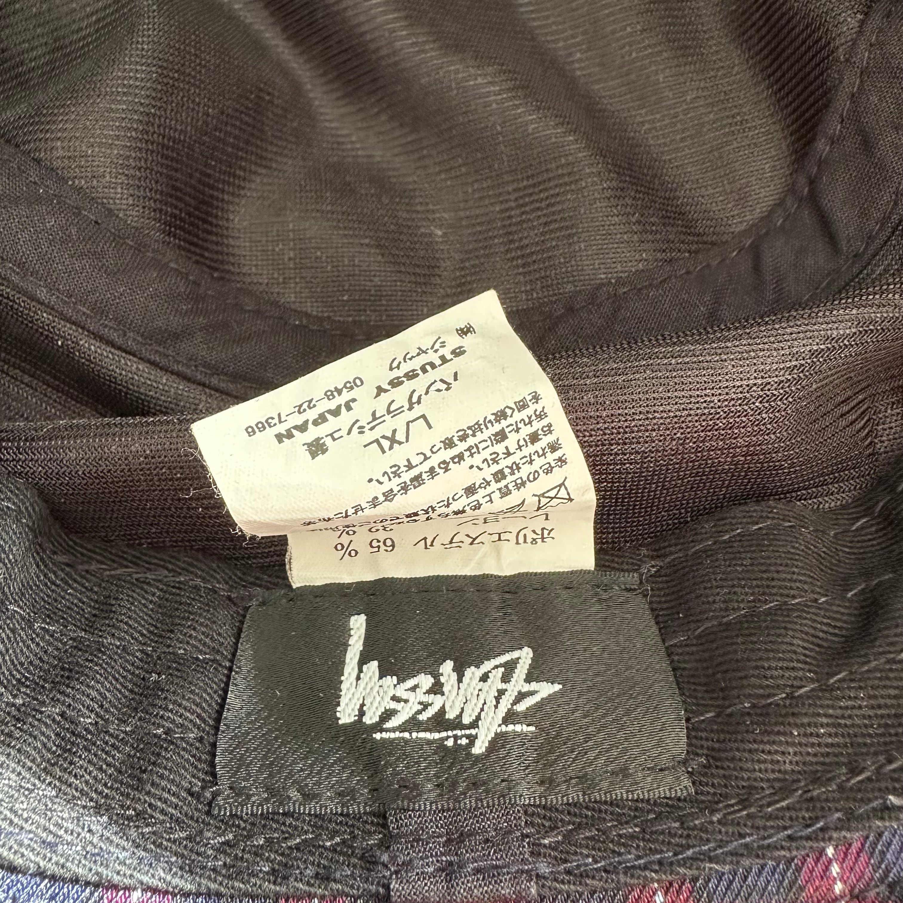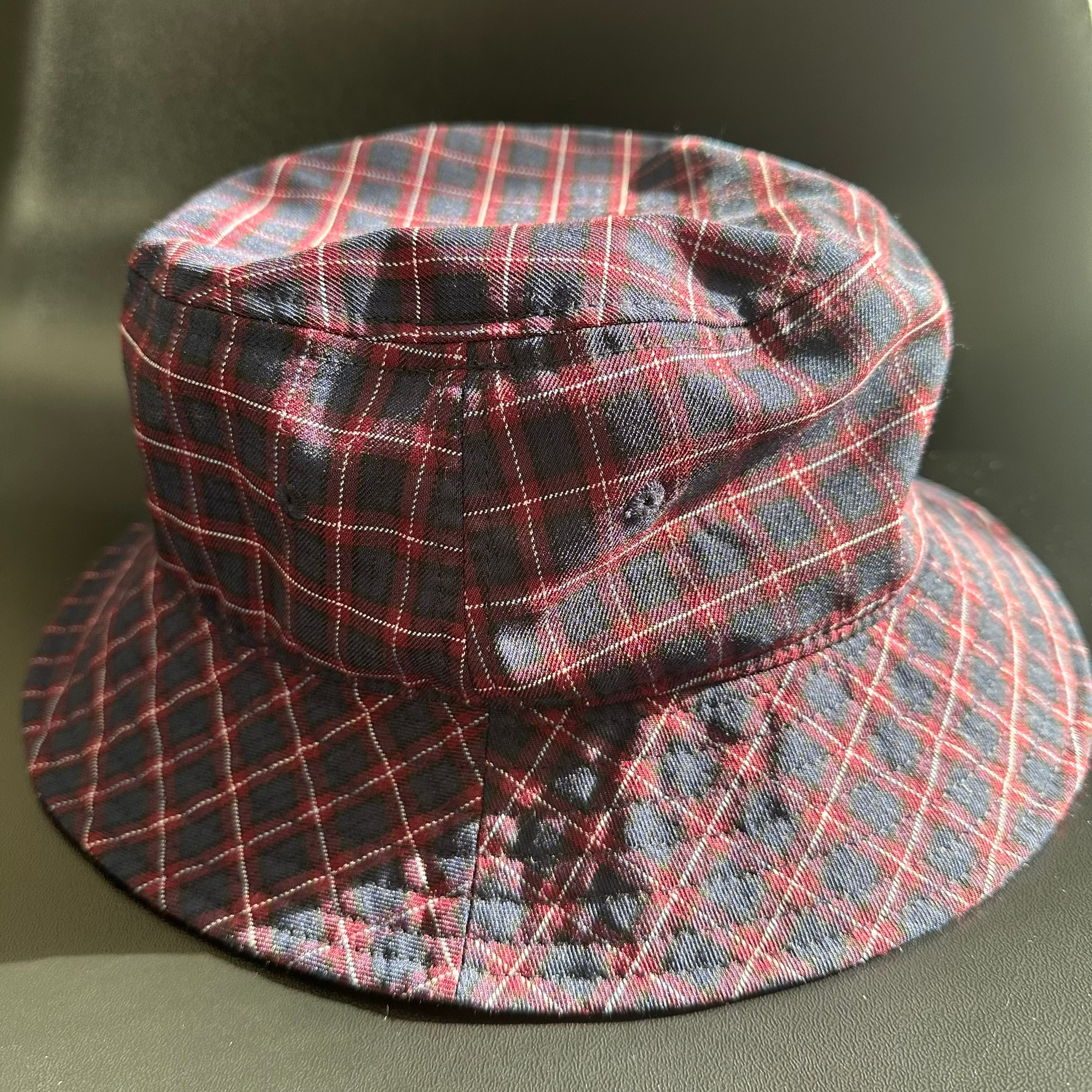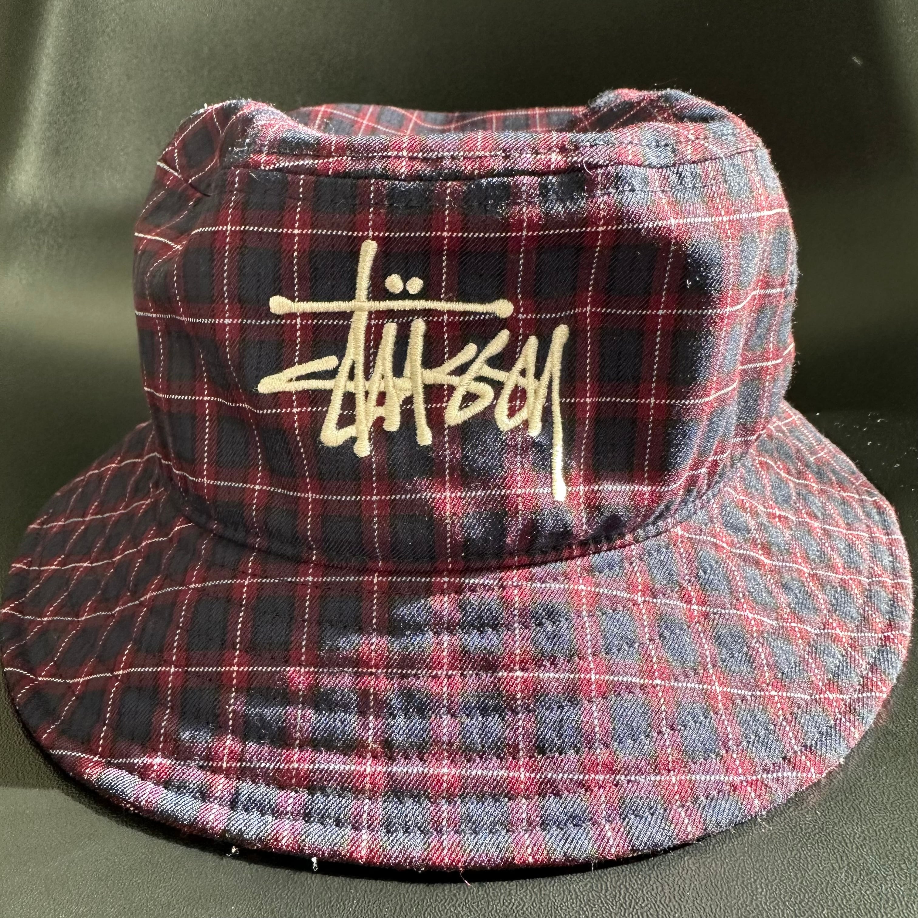 ステューシー、チェックBODYに、ステューシーのアイコン「ストックロゴ」をビッグサイズで刺繍したバケットハット。