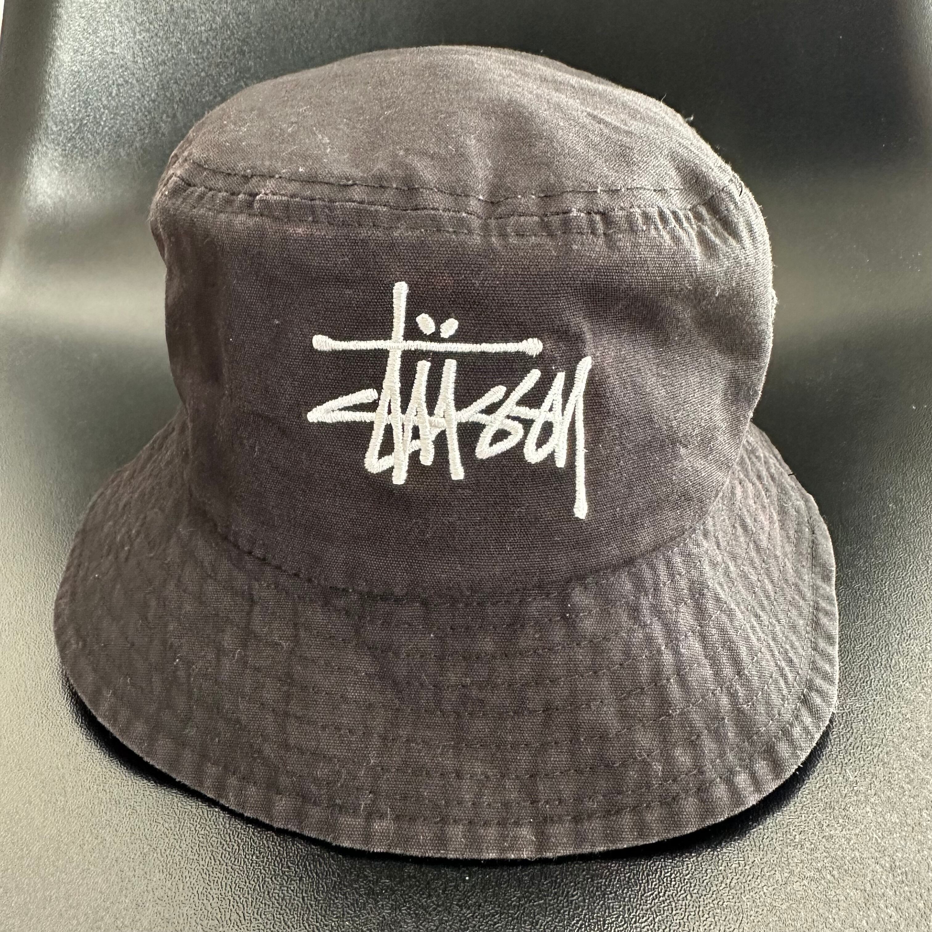 ステューシー、フロントにビッグストックロゴの刺繍が入ったバケットハット。色はブラック。