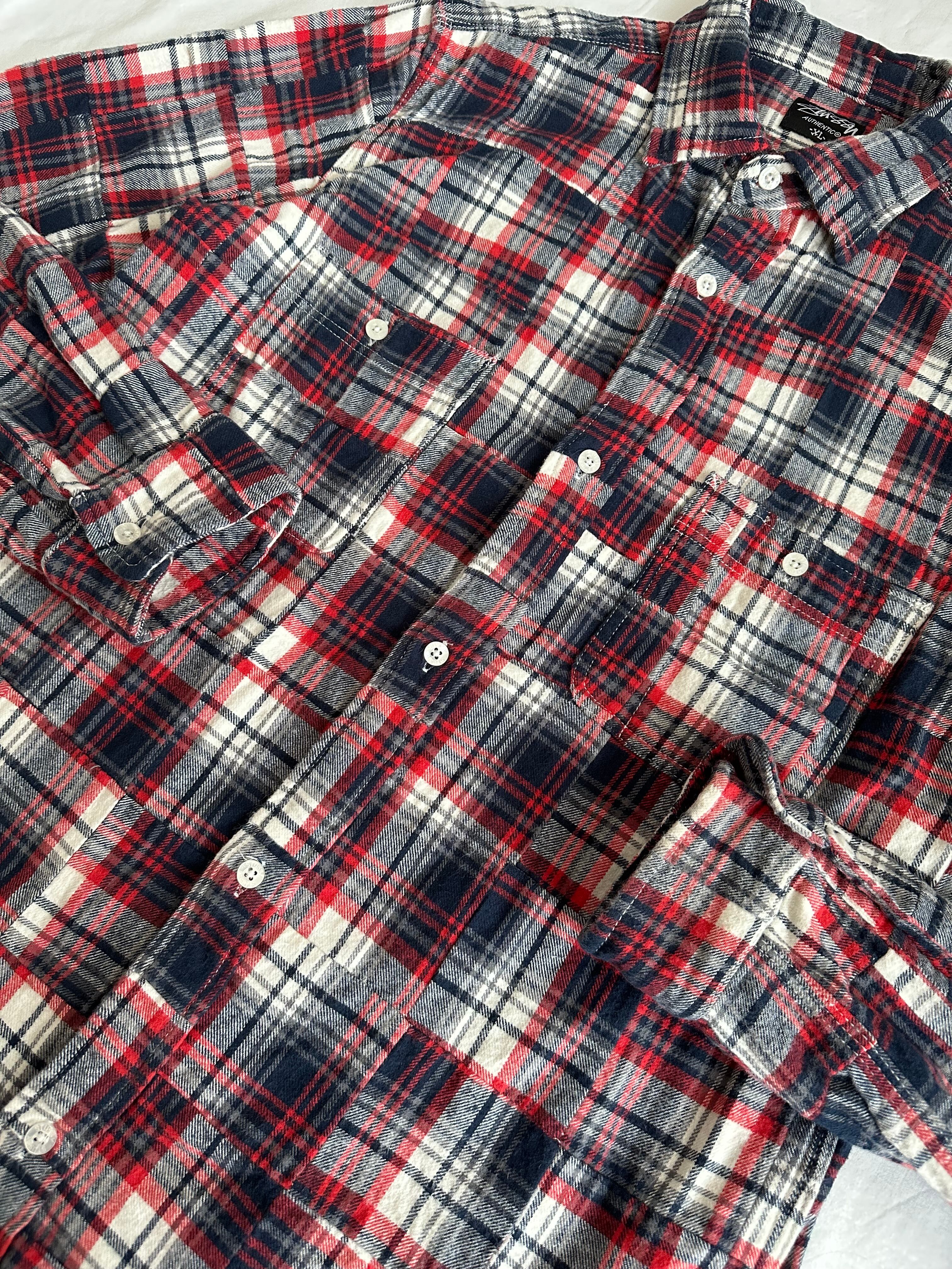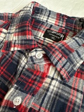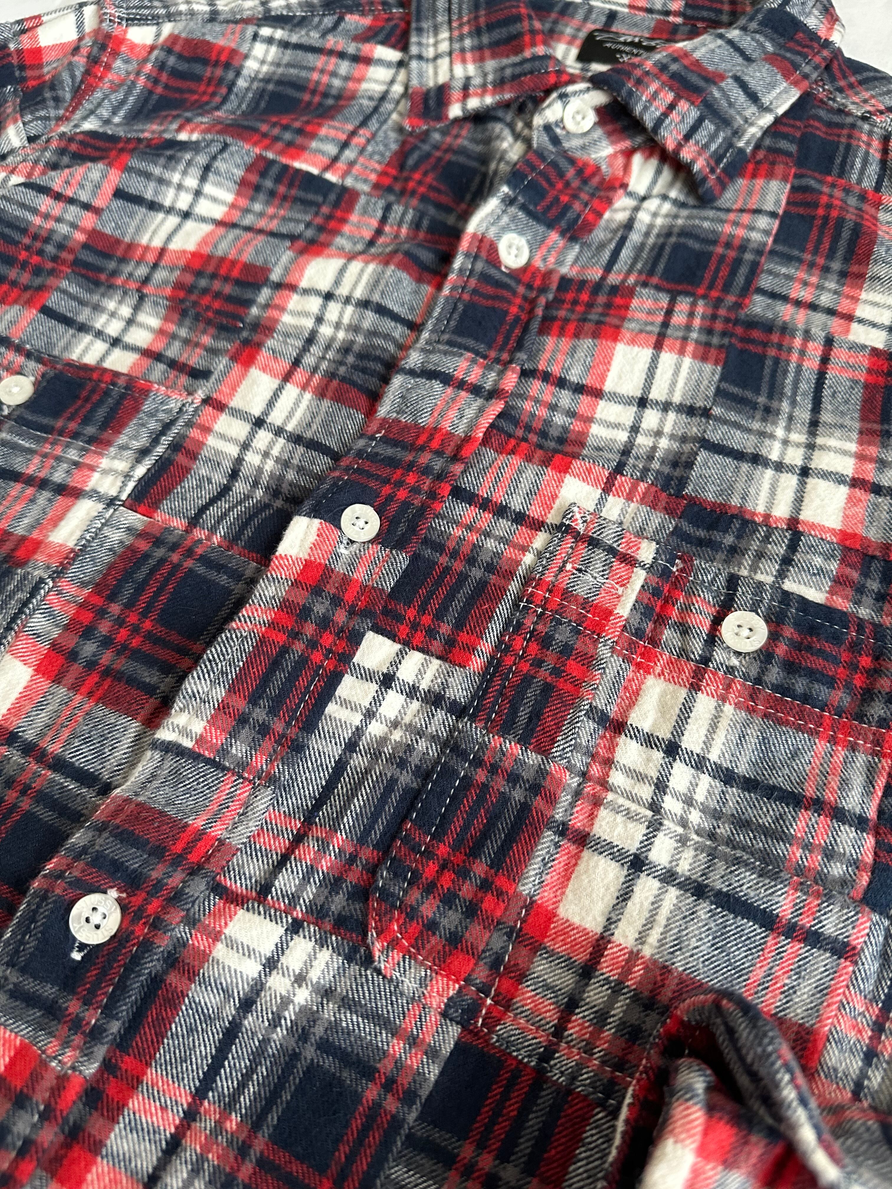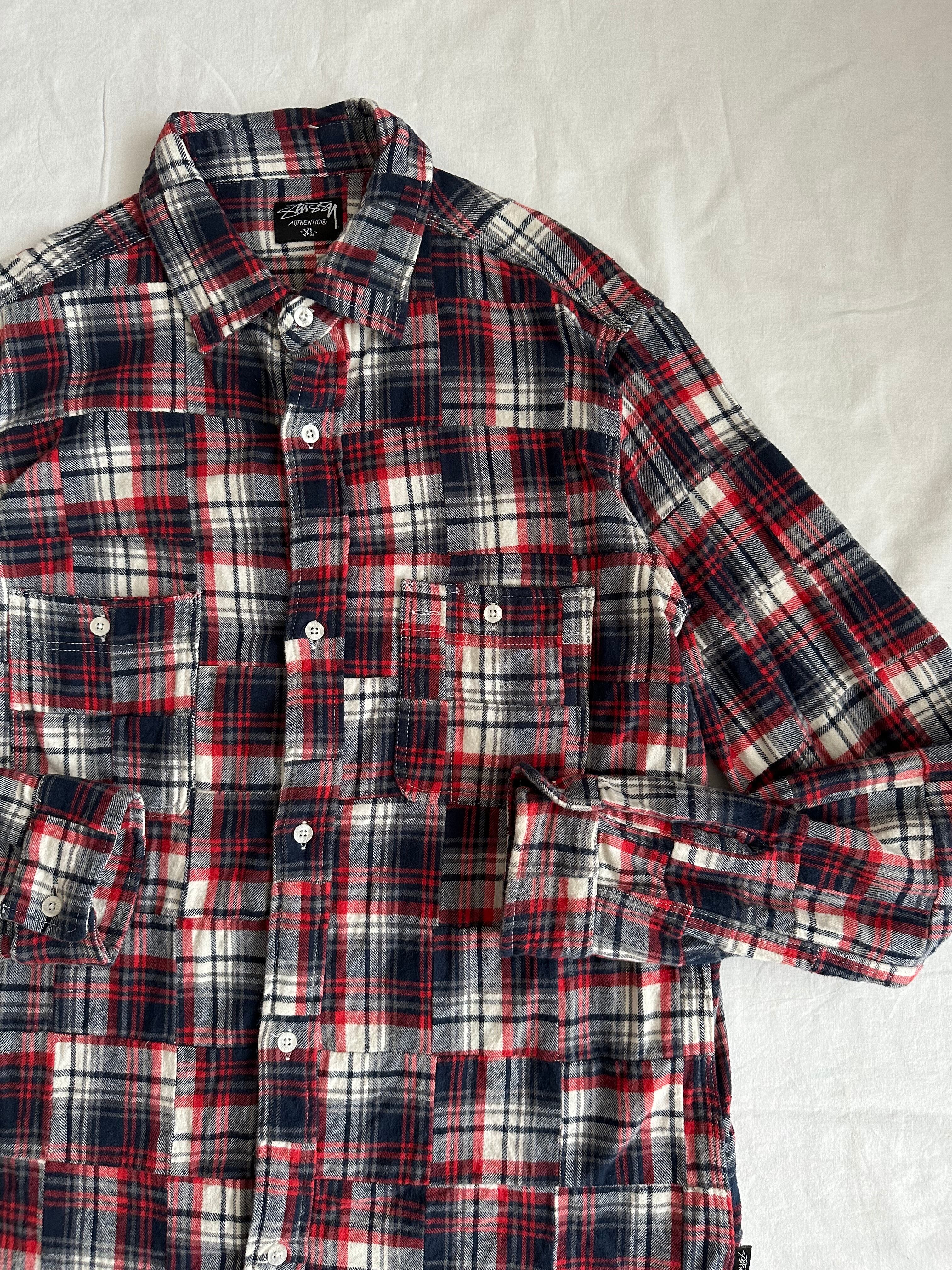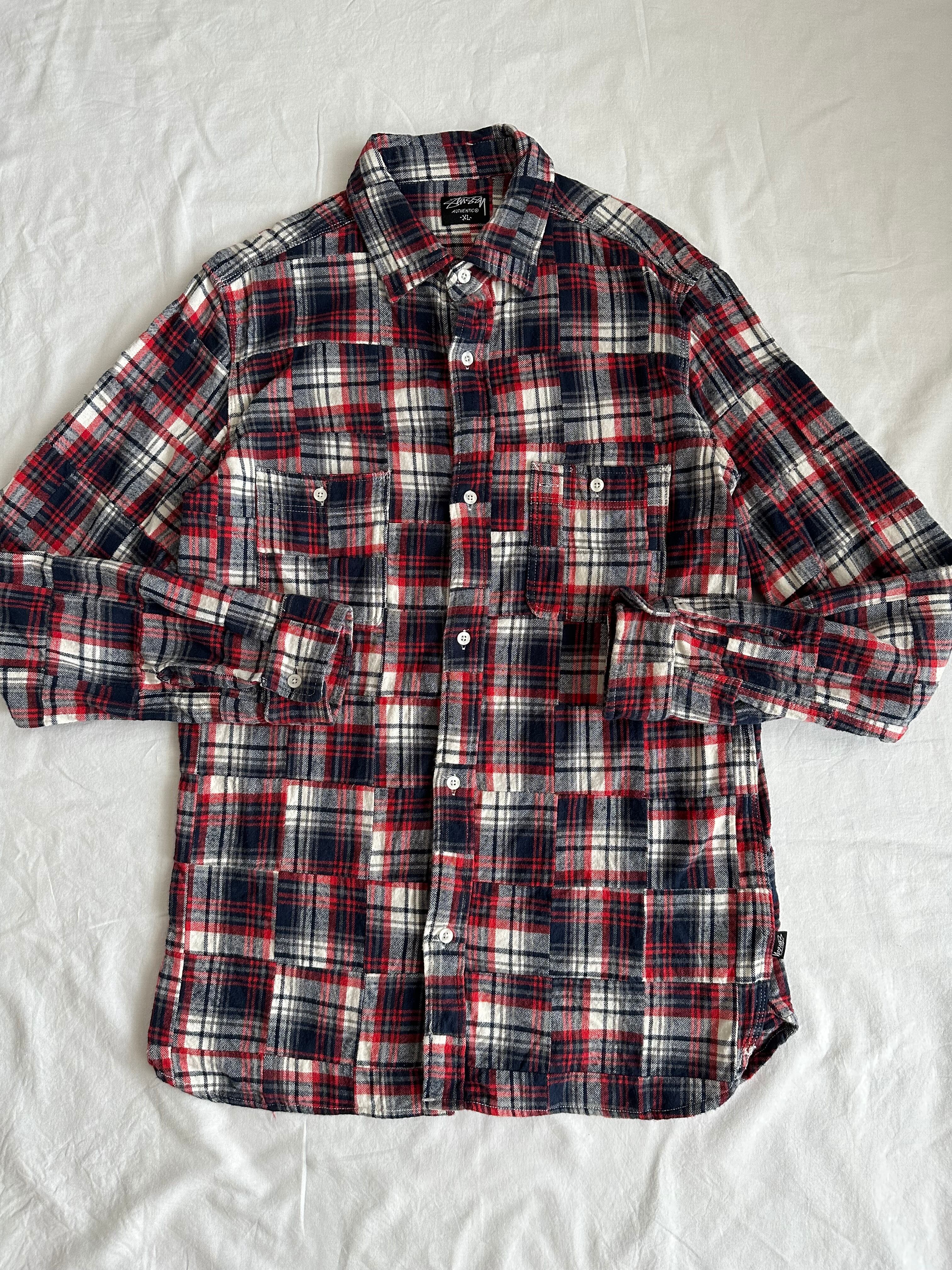 ステューシーのフランネルパッチワークチェックシャツ。レッド/ネイビーのコンビチェック。