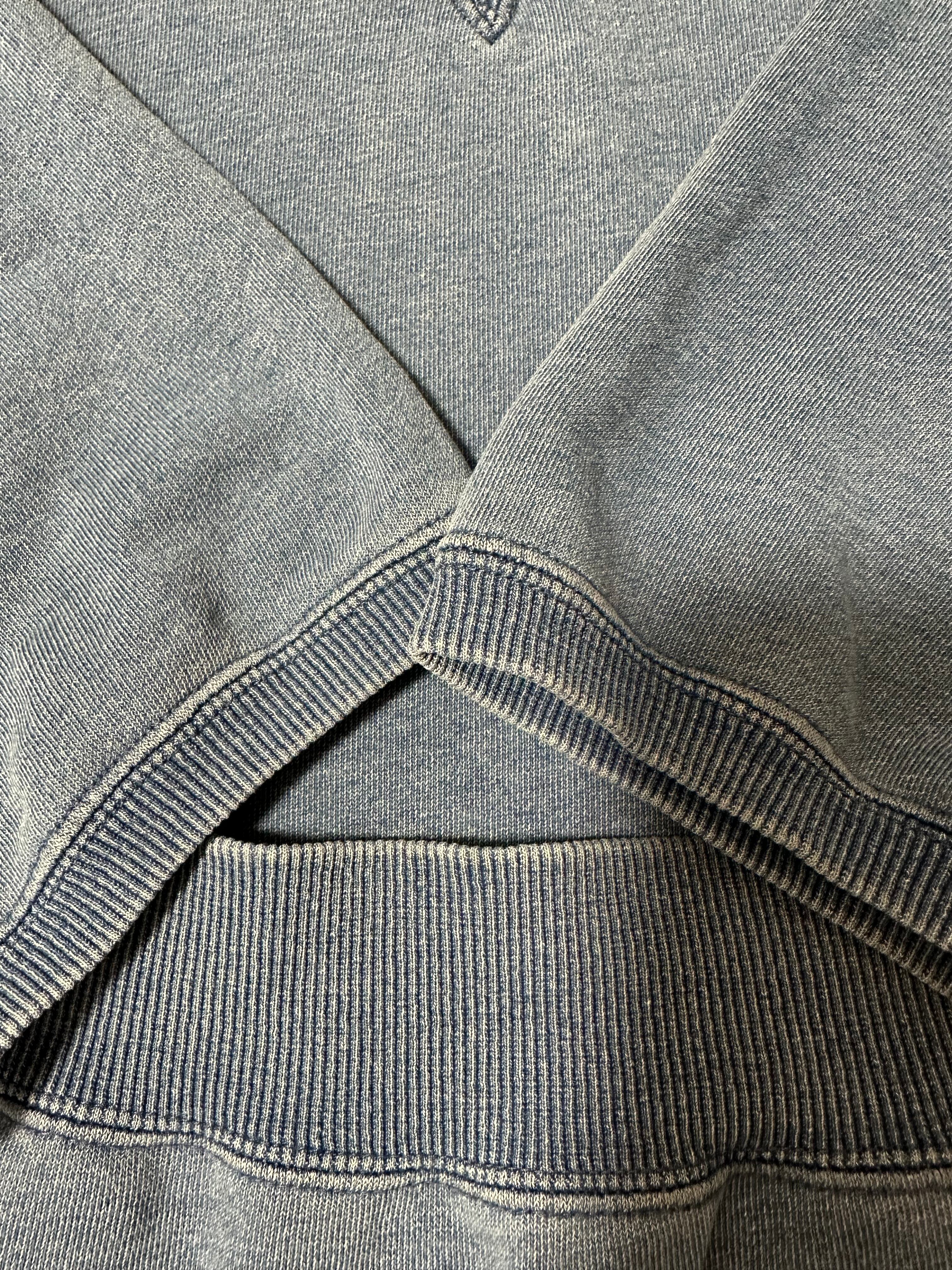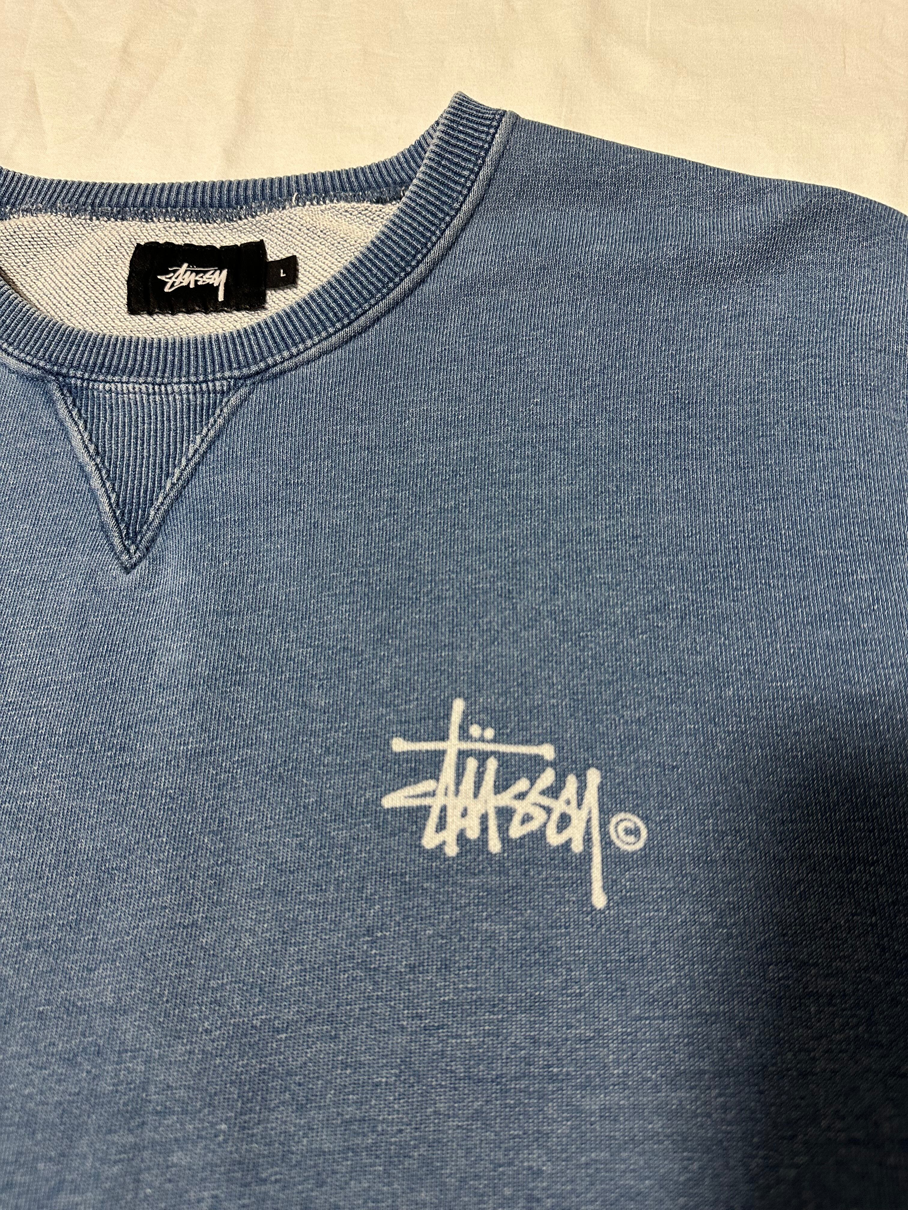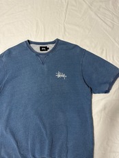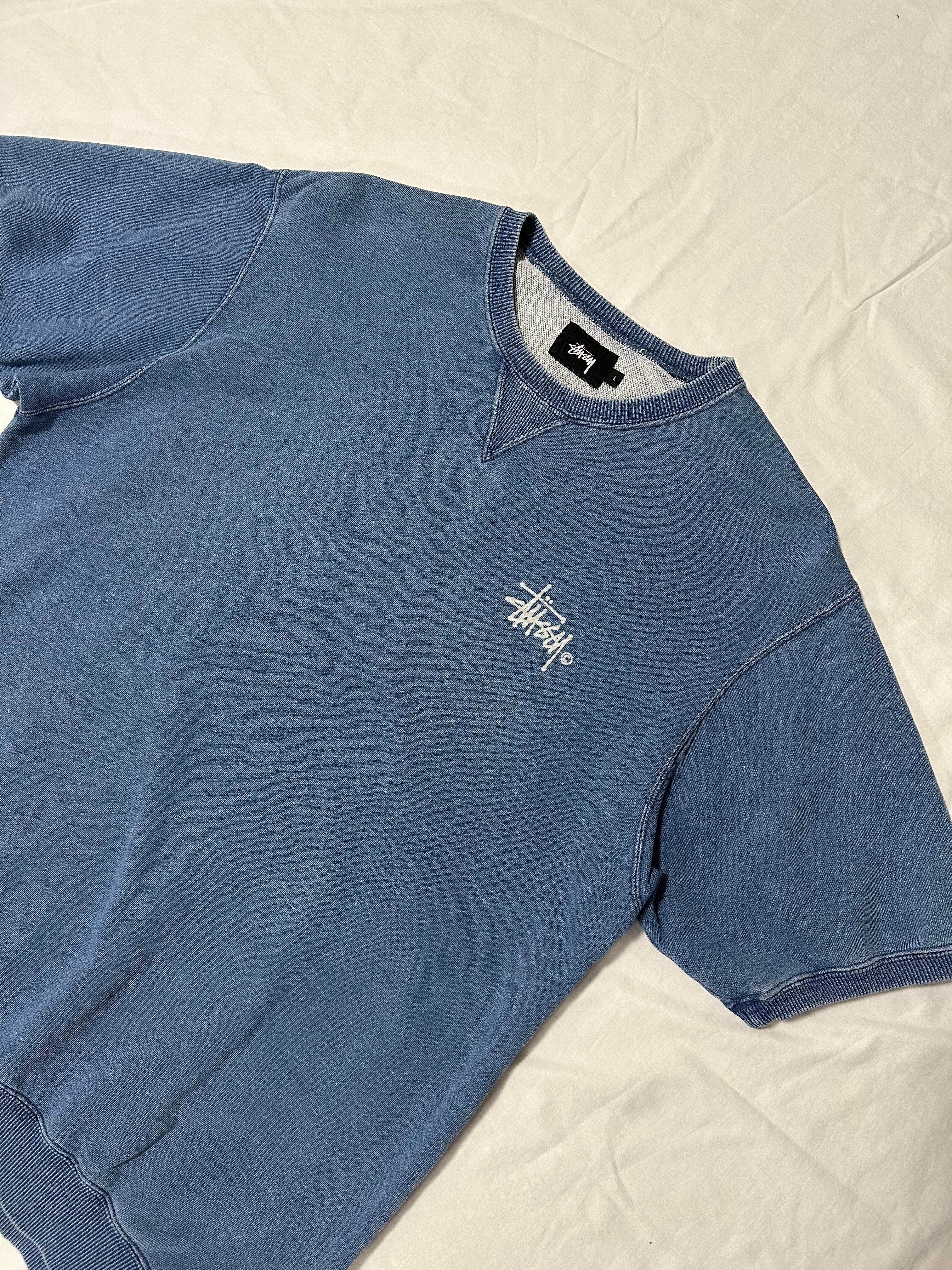 ステューシー、ウォッシュ掛かったインディゴブルーに前Vディテールのビンテージライクな半袖スウェット。胸元、背面にストックロゴを配置。