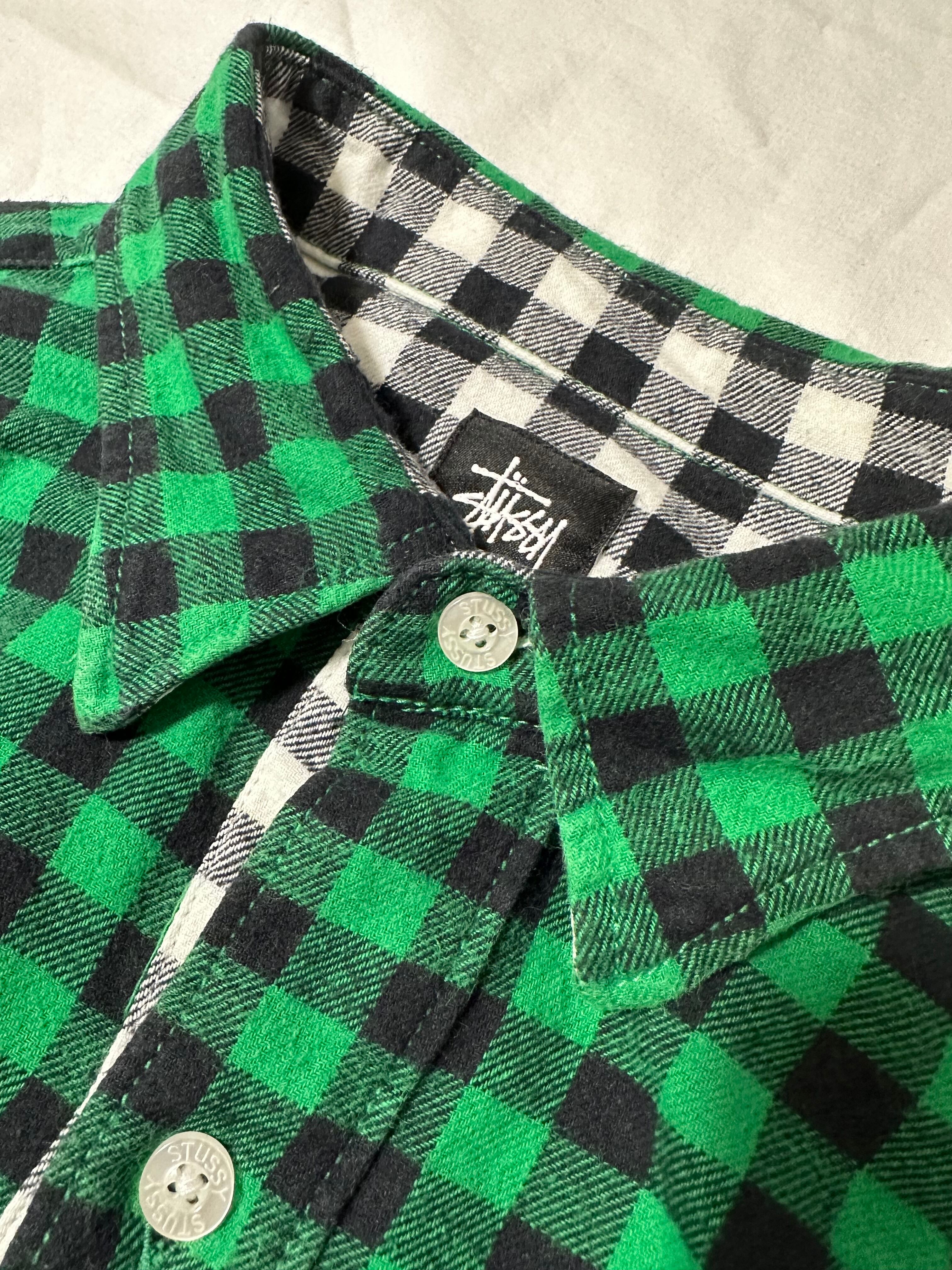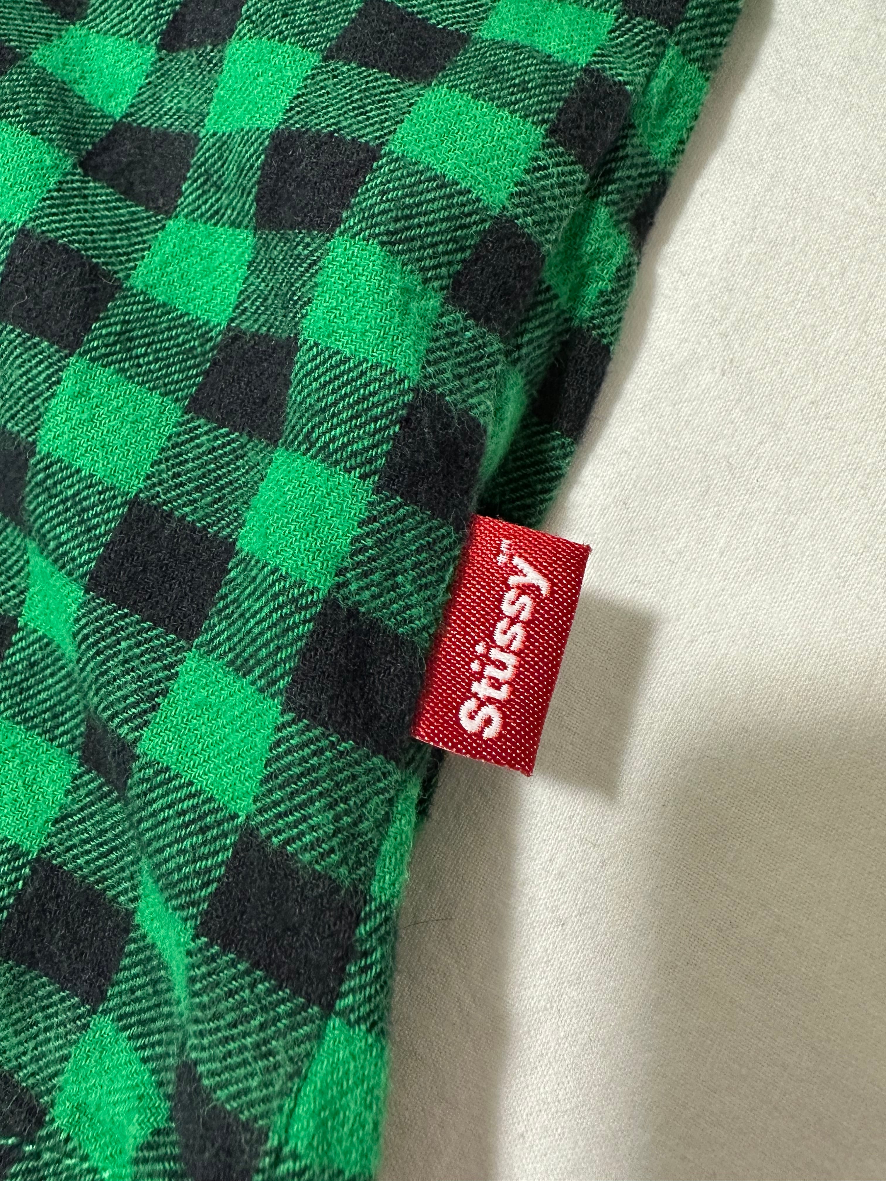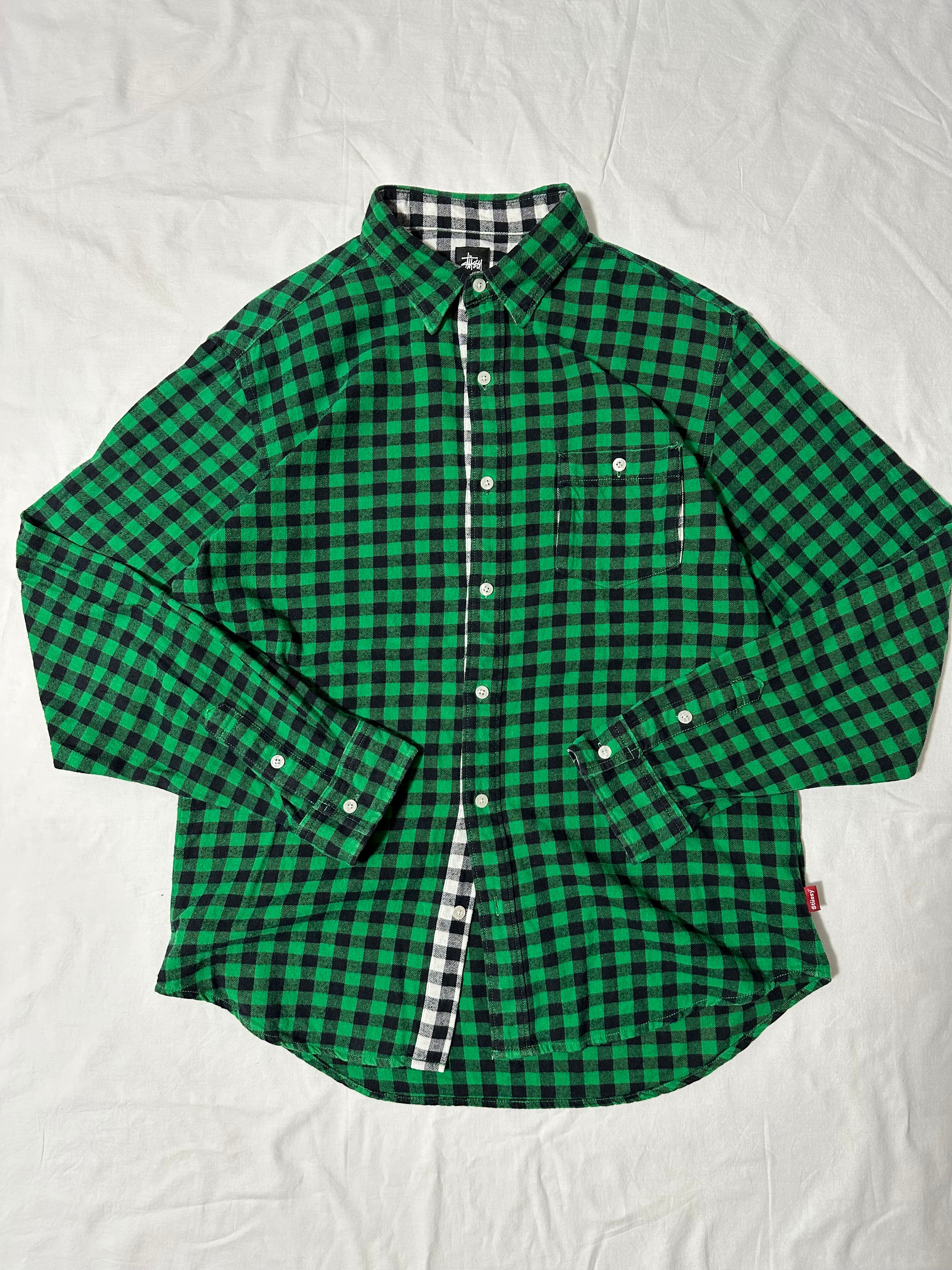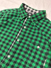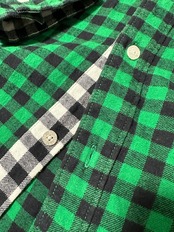グリーンにブラックのブロックチェック、内側はホワイトの切り替えチェックでカジュアルな印象。