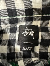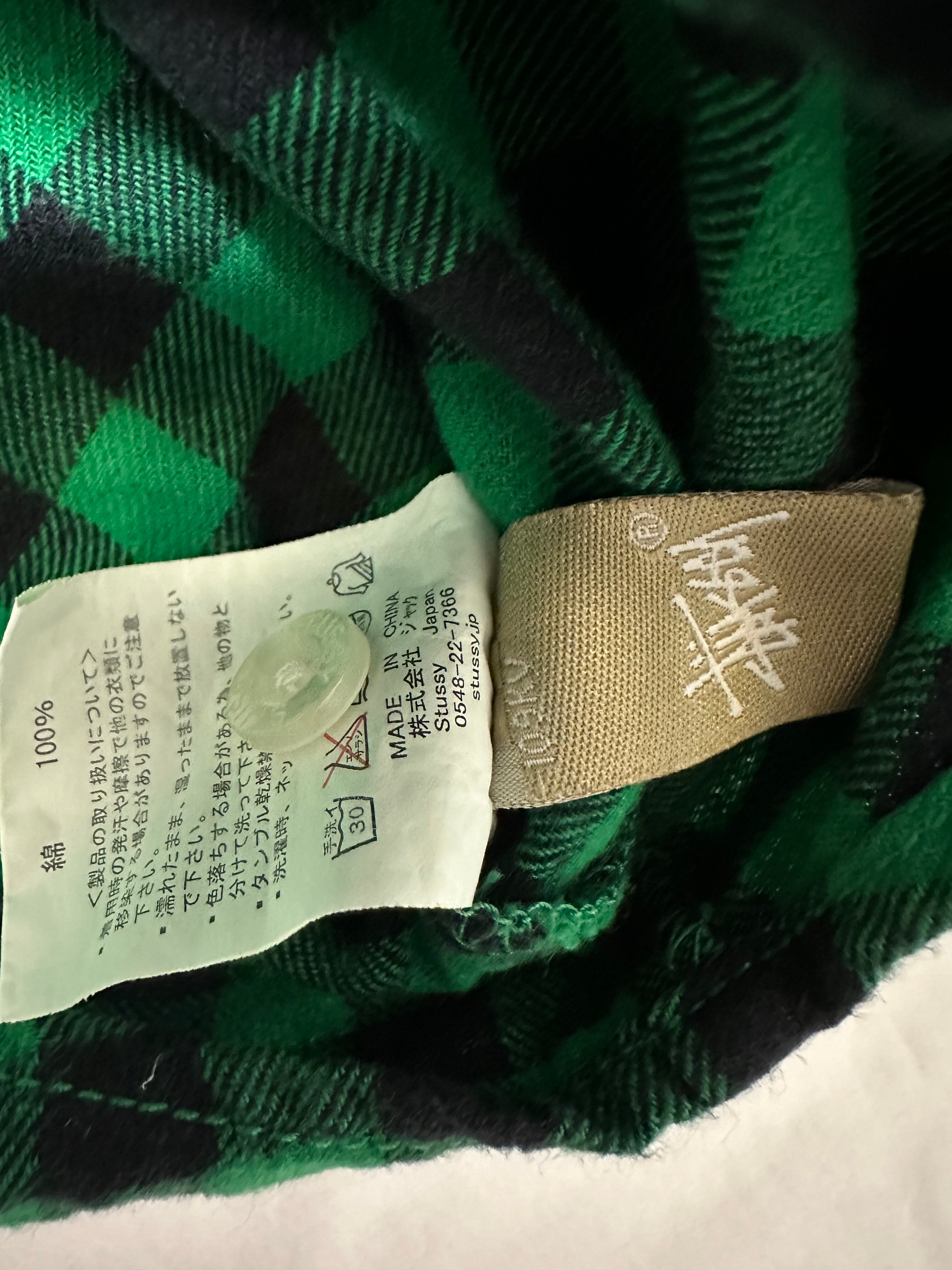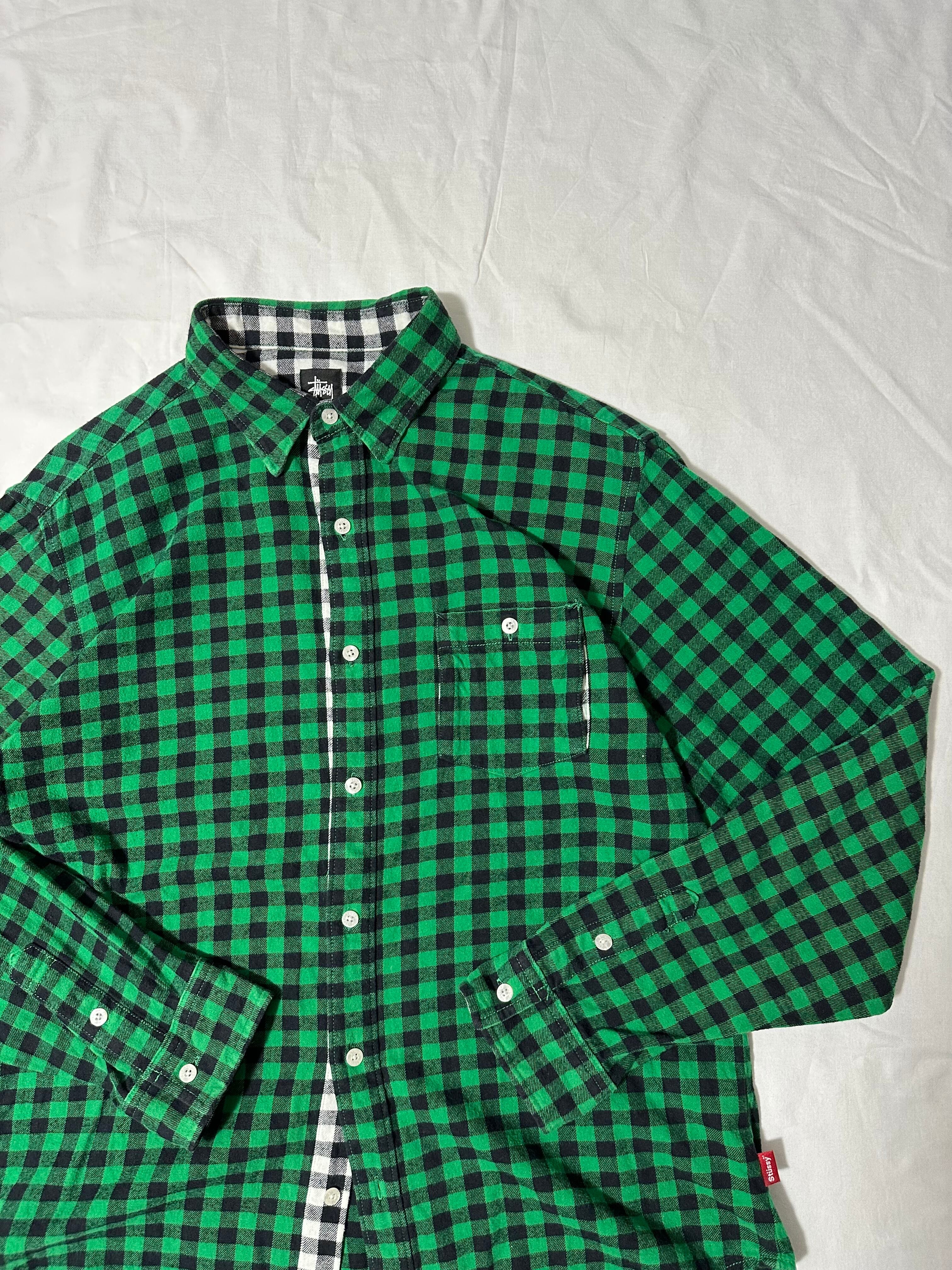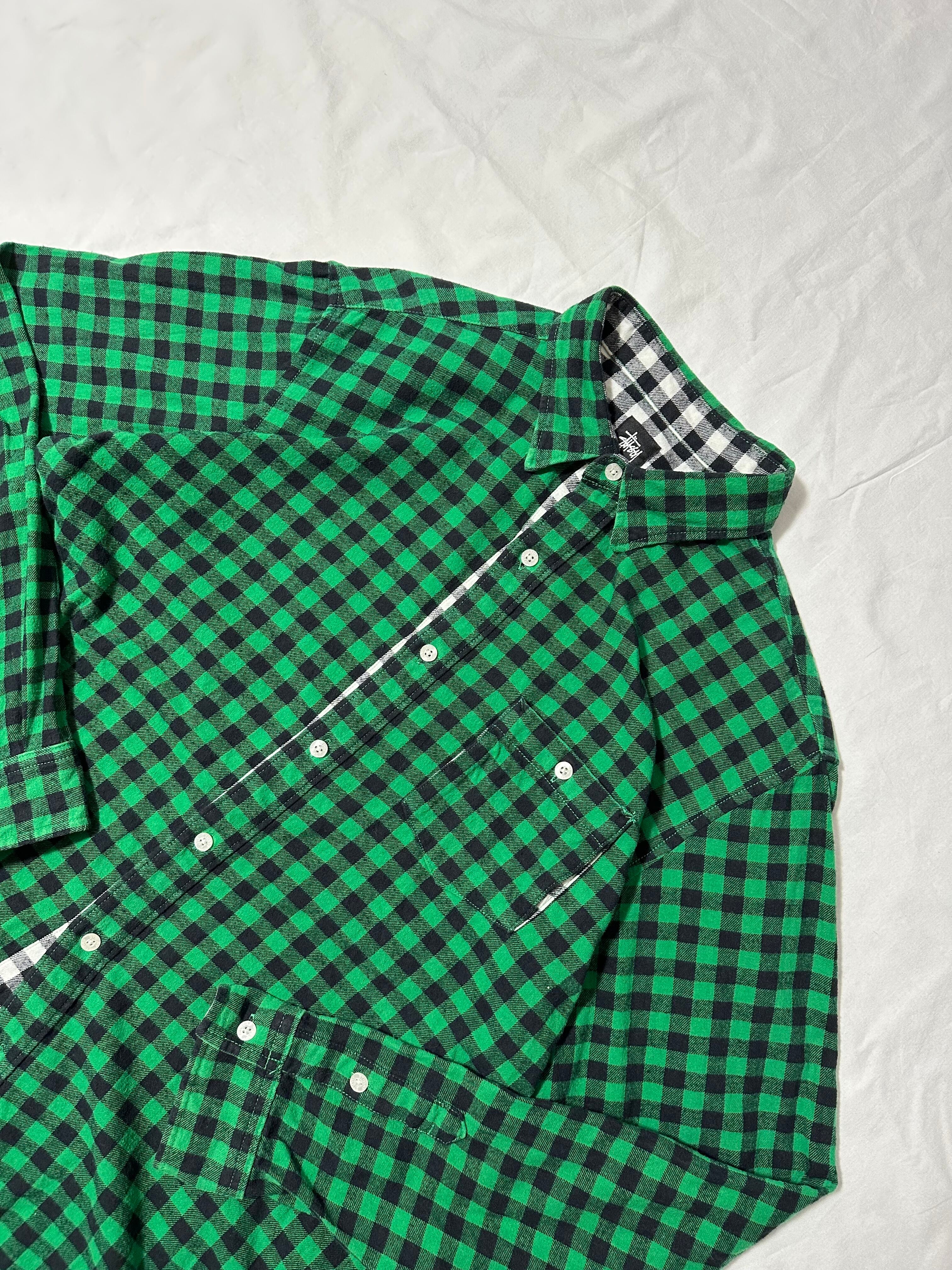 グリーンにブラックのブロックチェック、内側はホワイトの切り替えチェックでカジュアルな印象。