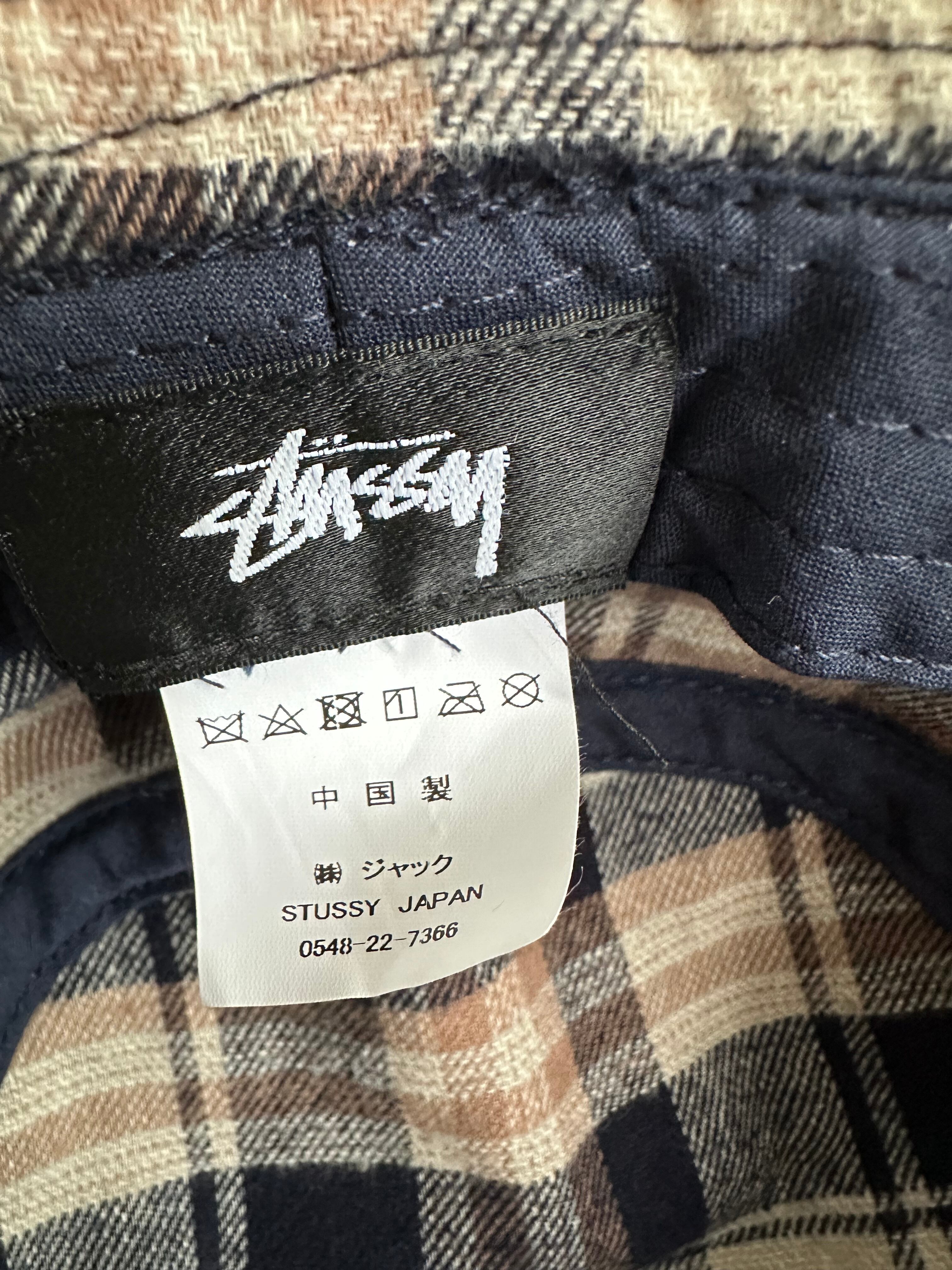 ステューシー、チェックBODYに、ステューシーのアイコン「ストックロゴ」をビッグサイズで刺繍したバケットハット。