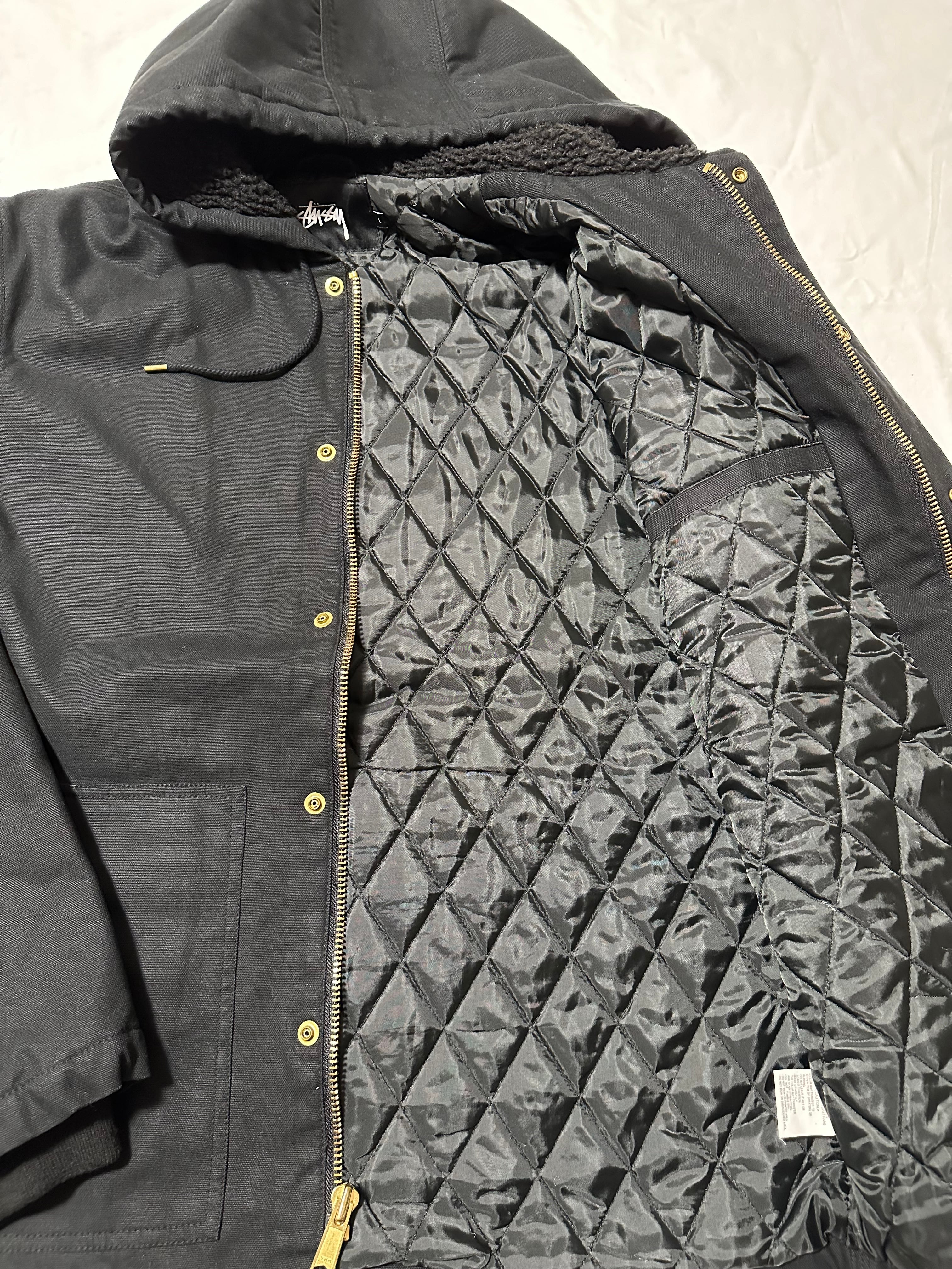 ステューシー、コットンダックジャケット。裏地にはキルティング素材を使用した保温性の高い仕様になっています。フードの裏地はボア仕様。ブラック。