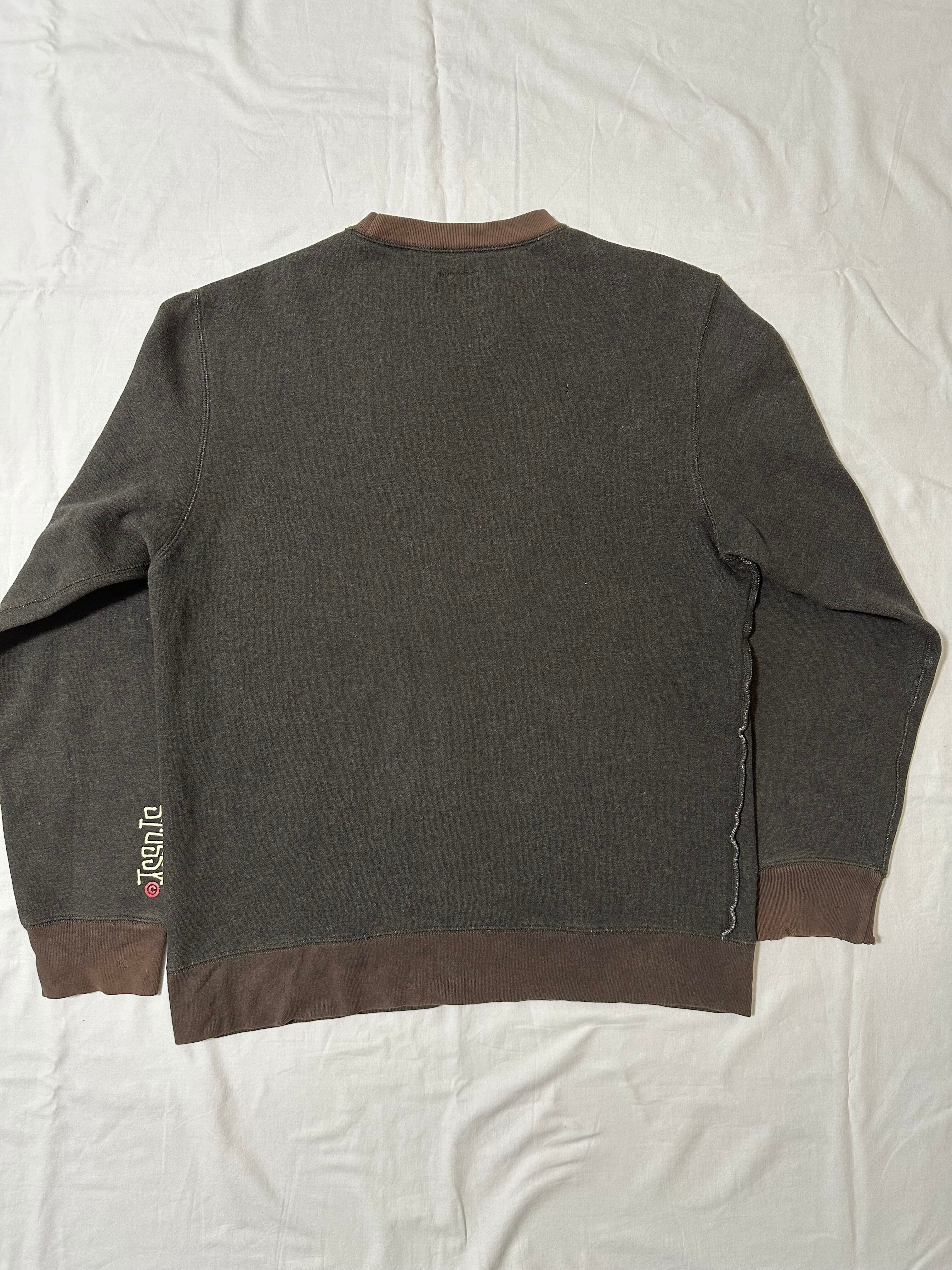 00sステューシーのチャコール/ブラウンのバイカラースウェット!左右の袖口にダメージ加工風のリペアがあり、人気の00sステューシーと雰囲気系usedの良いとこ取りなビンテージライクな1着になっています!